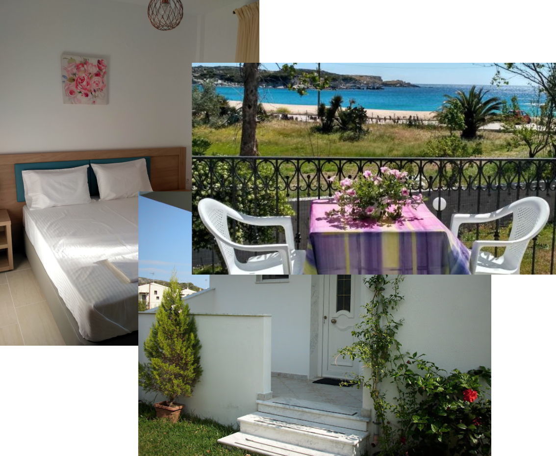 Το συγκρότημα αποτελείται από 4 διαμερίσματα με ξεχωριστά υπνοδωμάτια και 5 studios από το οποία τα 3 είναι τετράκλινα (1 διπλό κρεβάτι και μια κουκέτα κρεβάτι) και τα 2 τρίκλινα.(1 διπλό κρεβάτι και ένα μονό).Κάθε διαμέρισμα και κάθε studio έχει μπάνιο και κουζίνα με όλα τα απαραίτητα μαγειρικά σκευή και ψυγείο. Επίσης το καθένα έχει αυτόνομο μπαλκόνι με θέα την θάλασσα και το βουνό .Όλα τα δωμάτια έχουν air condition και ζεστό νερό όλο το 24ωρο.